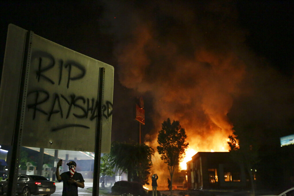 Protesters on Saturday night set fire to the Wendy’s restaurant where Brooks was fatally shot the night before and blocked traffic on a nearby highway.